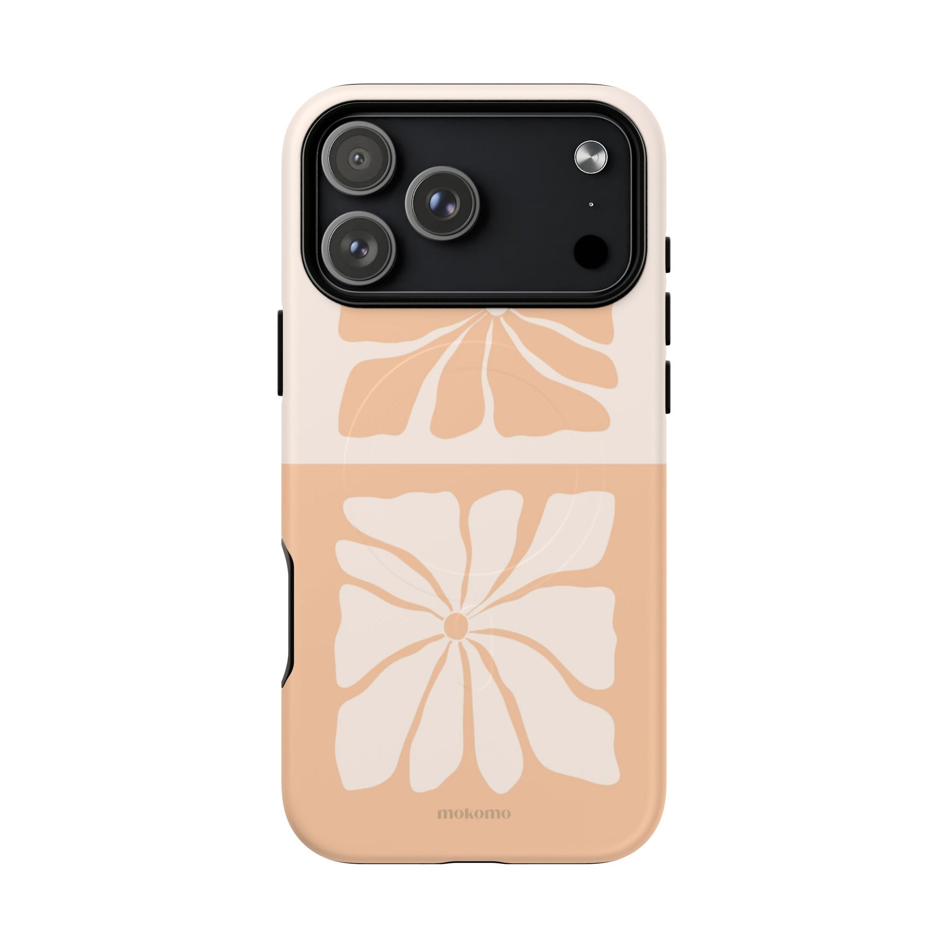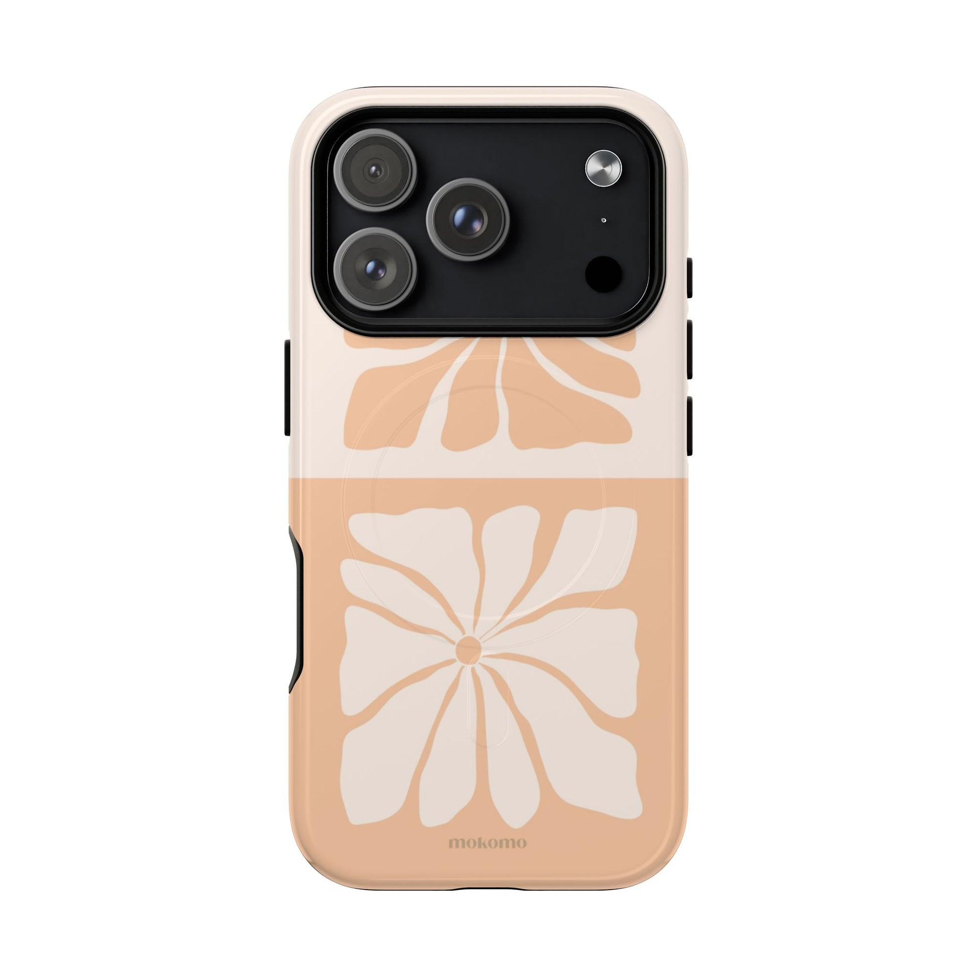 The beauty of imperfection as hand-drawn flowers reflect each other in sweet harmony. The delicate apricot and white tones give a soft, dreamy quality to this case.